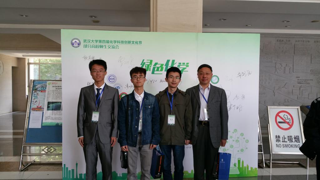 4月22日上午,beat365高秋明教授带领2014级本科生苗伟宁、蓝昊和杨焱参加了武汉大学举办的第四届“化学科技创新文化节”部分高校师生交流会。此次交流会共有来自吉林大学、南京大学、哈尔滨工业大学、武汉大学等18所高校本科生队伍参与。