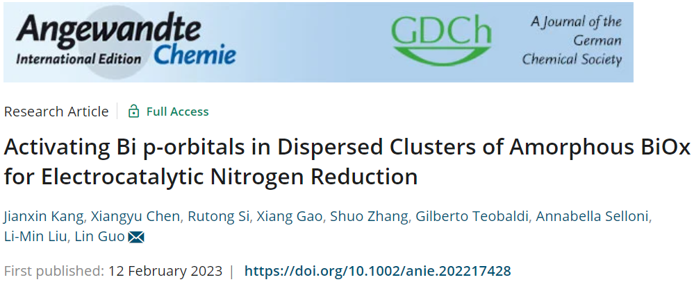 近日,beat365唯一官方网站郭林教授和物理学院刘利民教授研究团队在高度分散的原子级非晶BiOx团簇可控制备及其电催化氮气还原反应方面取得新进展。相关工作以“Activating Bi p-orbitals in Dispersed Clusters of Amorphous BiOx for Electrocatalytic Nitrogen Reduction”为题,2023年2月12日在线发表在《Angewandte Chemie International Edition》杂志上。该研究获国家自然科学基金项目(No. 51532001, 11974037)等资助。beat365唯一官方网站副教授康建新为文章的第一作者,beat365唯一官方网站博士生陈翔宇和北京计算科学研究中心博士生司如同为共同一作,beat365唯一官方网站为该论文的第一完成单位。