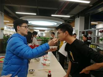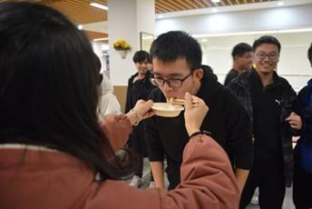 在第一锅饺子出锅后,我们的第一个游戏便开始了。首先我们进行的是抢水瓶游戏,beat365唯一官方网站的导员黄澄玉和丁少松同学给大家做了一个示范,主持人说出一个身体的部位,两人分别摸自己的相应部位,在主持人说出“水”这个字的时候,两个人同时去抢桌子上的水瓶,但是黄导更快一步,于是作为输了游戏的人要被黄导喂五个饺子,场景太有爱了。之后同学们也积极加入到这个游戏中来,这也是一个很幸福的游戏了。